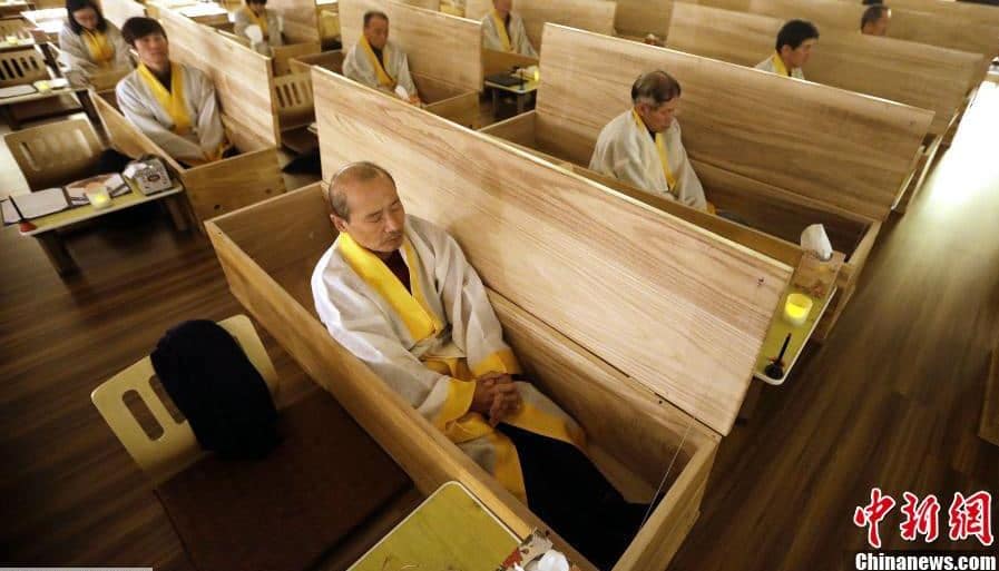 Chaque stagiaire est placé devant la boite qui lui est dévolue, il lit ses dernières volontés à voix haute, on prend son portrait funéraire, il s’assoie dans la boite, puis s’allonge avant qu’on ne lui lie le corps comme il est de rigueur dans les obsèques en Corée. Le couvercle est rabattu, et la personne demeure entravée et enfermée de 5 à 10 minutes.