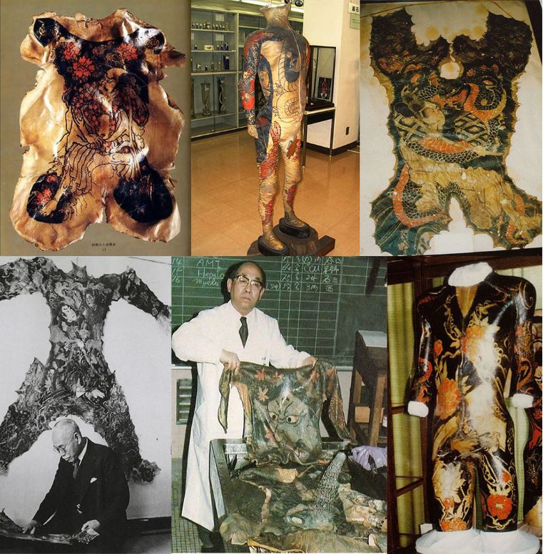 La collection de peaux tatouées du Musée de Pathologie de Tokyo a été montée par le Docteur Fukushi à partir de 1926 (voir photo ci-dessous), un passionné du sujet qui a récupéré et conservé une centaine de peaux, majoritairement prélevées sur des yakuzas. Ce médecin n’hésitait pas à monnayer ces peaux, voire à payer les tatoueurs pour ensuite avoir un droit de regard sur les œuvres. Dernièrement le département a pris contact avec le grand tatoué australien Geoff Ostling pour négocier son derme, ce dernier n’est pas hostile au projet mais il veut être conservé en intégralité, étant tatoué partout sur le corps et pas seulement sur le périmètre habituel des yakuzas qui exclue les mains, les pieds et le visage.