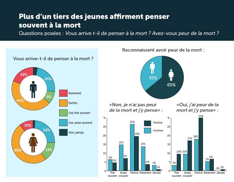 Ce même public n’hésite plus à envisager sa propre mort, à y penser assez souvent comme l’avouent 24 % des personnes interrogées, tous sexes confondus. 65 % de femmes et 35 % d’hommes vont même jusqu’à reconnaître qu’ils craignent cette échéance, et qu’ils l’anticipent.